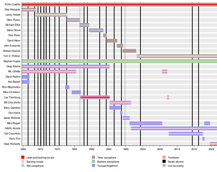 Castillo and Kupka remain the only constant members of TOP, the current incarnation of which also features former vocalist & keyboardist Michael Jerel (since 2025), trumpeter Adolfo Acosta (since 2000), tenor saxophonist Tom E. Politzer (since 2002), guitarist Jerry Cortez (since 2010), bassist Marc van Wageningen (since 2018), trumpeter Dave Richards (since 2023), drummer Pete Antunes (since 2024), and vocalist Jordan John (since 2024).