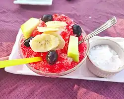 Non-dairy ice | A shaved ice dessert, sweetened with powdered sugar and a red fruit or flower syrup. Additional toppings are added, usually fruits. Originating in the city of Adana. Although the taste is different, due to the use of different toppings and syrup, it is very similar to Korea's Bingsu |