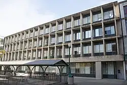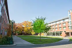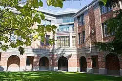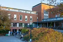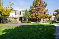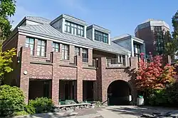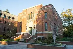 University of Oregon real estate includes buildings in a variety of architectural styles and eras. Many buildings on the main campus were designed by Ellis F. Lawrence, who joined the university in 1914 as campus planner, but by 1915 he had founded the School of Architecture and had become chief architect of the university. Lawrence also held a commission to design all buildings on campus as long as he remained in charge of the School of Architecture. This commission was a source of extra income for Lawrence, and he designed buildings until his death in 1946.[1] Some of the Lawrence buildings are listed on the National Register of Historic Places. Others are not themselves listed but are included in NRHP site surveys. The Memorial Quadrangle, for example, contains buildings listed as contributing resources in the site survey for the Knight Library.[2] These buildings are Condon Hall, Chapman Hall, and the Jordan Schnitzer Museum of Art, although the museum is also separately listed.[3] The Women's Memorial Quadrangle is listed on the NRHP, and it contains three more Lawrence buildings which are contributing resources, Gerlinger Hall, Hendricks Hall, and Susan Campbell Hall.[4]