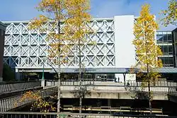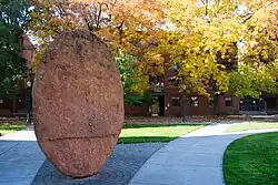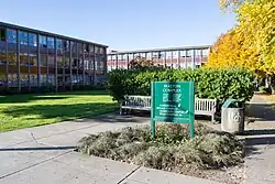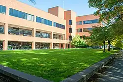 Named for university president Prince Lucien Campbell, PLC is home to many departments and a large auditorium.[n 30] The Oregon Companion described PLC as "...a pugnaciously ugly eight-story semi-skyscraper office building" and adds, "He deserved better."[n 31] Part of the Memorial Quad |