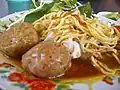 Noodle dish | Deep-fried egg noodles, topped with seafood, vegetables, and a sauce | |