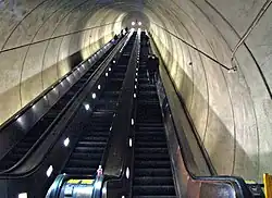 Pylon by the entrance to the Archives stationPassengers boarding a train at the Bethesda stationCrossvault of the L'Enfant Plaza stationUnion Station, the busiest station in the systemThe longest continuous escalator in the western hemisphere, at the Wheaton station[7]Vaulted ceiling at Farragut WestDowntown Largo station, one of the newest stationsArlington Cemetery station on a snowy dayElevated platform at National AirportWiehle-Reston East station on the first day of Silver Line service in 2014