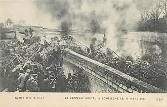 8.30 p.m. that the airship was reported ... 6,000 ft. ... over Sommeille, using its searchlights for a brief moment. ... flew over Révigny ... The third shell, an incendiary one, found the target. ... came to earth slowly ... no explosion until the Zeppelin touched the ground ... seen by many ... from ... Révigny, ... village of Brabant-le-Roi ... Ten miles away, another Zeppelin, ... watched the fate of its companion and then turned and disappeared. At the same time a third Zeppelin flew over Lunéville and dropped bombs ... German source gives the following details ... carried over twenty of a crew, eight machine guns, and on the overhead platform two 'revolver' guns. Her orders were to bomb the railway junctions behind the front, especially, perhaps for its importance to Verdun (which is only some thirty miles away). ... three aeroplanes accompanied the Zeppelin.