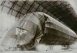 Extensively damaged on 17 May 1915 by Flt Commander Bigsworth. Three raids on the western and two on the eastern front, dropping 4,184 kg (9,224 lb) of bombs. On 17 December 1915, captained by Dr. Lempertz, LZ 39 was hit by shrapnel during an attack on Rovno. All rear gas cells were punctured and the front engine car was hit and later fell off. The crew abandoned the now-overstressed control cabin, dropped ballast and shifted loads to rebalance the ship and used an emergency control station in the rear to limp back to Germany. Upon forced landing the ship collapsed because material for repair and the supply of gas needed to refill the cells were not available.[32] | Decommissioned 17 December 1915 |