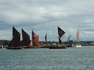 A Thames sailing barge is a type of commercial sailing boat once common on the River Thames in London. The flat-bottomed barges with a shallow draught and leeboards, were perfectly adapted to the Thames Estuary, with its shallow waters and narrow tributary rivers. The larger barges were seaworthy vessels, and were the largest sailing vessel to be handled by just two men.[1]