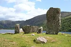 An axial five-stone circle is a particular type of megalithic ring of five stones of which many are found in southwest Ireland. These circles have an approximate axis of symmetry aligned in a generally northeast–southwest direction – the stone at the southwest side of the circle, rather than being an upright orthostat like the rest, rests on the ground with its long axis horizontal. Because it marks the axis it is called the axial stone. It is usually quite thin and it lies with its long thin edge along the circumference of the ring.[1][2]