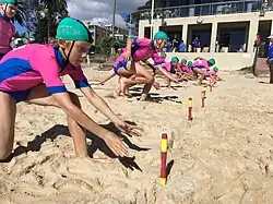 - Beach flags – Australian lifesaving activity to practice sprinting across soft sand; competitors run towards a limited set of flags wedged into the sand a distance away in an attempt to retrieve one (the concept operates very similar to musical chairs, eliminating one competitor per round by reducing the available flags each time until there is a winner).[16][17]