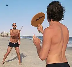 - Frescobol – played with solid, traditionally wooden rackets; typically between two players, the non-competitive aim is to maintain an airborne rally with a small rubber ball for as long as possible.[41][42]