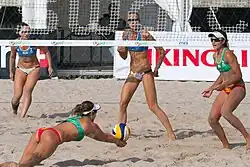 - Beach volleyball – derivative of volleyball played outdoors on soft sand, using a slightly larger and lighter ball, typically in two teams of two or occasionally four without substitutes, and best of three sets rather than five. Beach attire is a core aesthetic.[32][33] Currently the only Olympic beach sport.