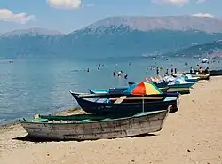 At a length of 8 km (5.0 mi), the beach extends from the city pier to the eastern end of Tushemisht and is divided into two sections: 1) the City beach, which stretches along the "1 Maji" promenade and features fine to medium sand; 2) Tushemisht and Drilon beaches, known for their more abrasive sand, which form part of the Drilon-Tushemisht Waterscape Park, covered in lush vegetation and characterized by springs that gracefully flow into the lake.[6]