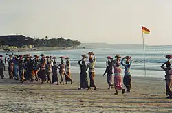 Some beaches are considered sacred and ritual processions are held on these. Sea temples are erected on the coasts of Bali, Lombok, and Java to appease the god or goddess of the Sea.[7][8] Some beaches on the southern coast of Java are considered sacred because of their association with the figure of Nyai Roro Kidul, Queen of the Southern Sea. In accordance with Javanese beliefs, people are warned not to wear green clothes on these beaches because the color is sacred to her and wearing it may offend her and cause the person to drown into the sea.[8][9][10] Rituals are enacted on beaches such as Parangtritis, Pangandaran, Karang Bolong Beach, Ngliyep, Puger, and Banyuwangi.[8][10]