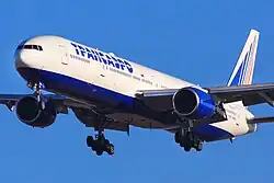 Transaero Boeing 777-300 landing at Vladivostok International Airport.