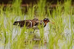 Bustards are large terrestrial birds mainly associated with dry open country and steppes in the Old World. They are omnivorous and nest on the ground. They walk steadily on strong legs and big toes, pecking for food as they go. They have long broad wings with "fingered" wingtips and striking patterns in flight. Many have interesting mating displays.
