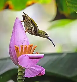 The sunbirds and spiderhunters are very small passerine birds which feed largely on nectar, although they will also take insects, especially when feeding young. Flight is fast and direct on their short wings. Most species can take nectar by hovering like a hummingbird, but usually perch to feed.