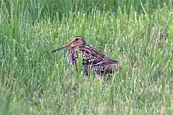Bustards are large terrestrial birds mainly associated with dry open country and steppes in the Old World. They are omnivorous and nest on the ground. They walk steadily on strong legs and big toes, pecking for food as they go. They have long broad wings with "fingered" wingtips and striking patterns in flight. Many have interesting mating displays.