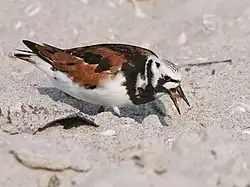 Bustards are large terrestrial birds mainly associated with dry open country and steppes in the Old World. They are omnivorous and nest on the ground. They walk steadily on strong legs and big toes, pecking for food as they go. They have long broad wings with "fingered" wingtips and striking patterns in flight. Many have interesting mating displays.