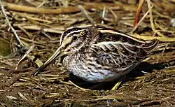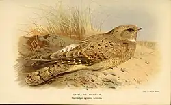 Nightjars are medium-sized nocturnal birds that usually nest on the ground. They have long wings, short legs and very short bills. Most have small feet, of little use for walking, and long pointed wings. Their soft plumage is camouflaged to resemble bark or leaves.