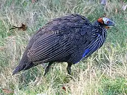 Guineafowl are a group of African, seed-eating, ground-nesting birds which resemble partridges, but with featherless heads and spangled grey plumage.