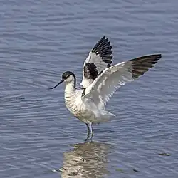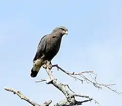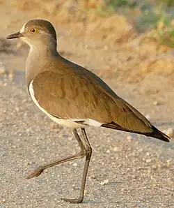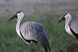 Bustards are large terrestrial birds mainly associated with dry open country and steppes in the Old World. They are omnivorous and nest on the ground. They walk steadily on strong legs and big toes, pecking for food as they go. They have long broad wings with "fingered" wingtips and striking patterns in flight. Many have interesting mating displays.