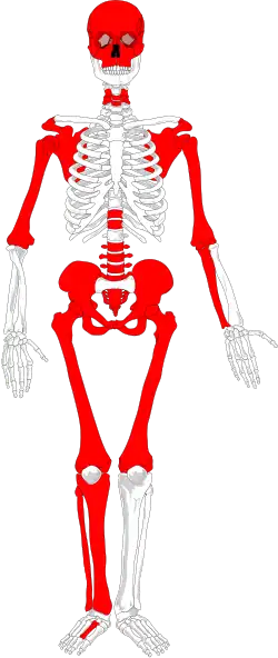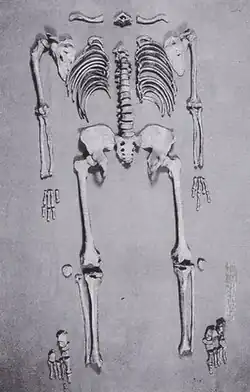 This completely skeletonized bog body of undetermined sex was either oversampled, lacked preservation or sustained damage during World War II. Surviving bones are marked red on image. | |