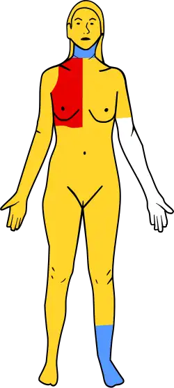 Due to the over-sampling of the remains, only the skin of the right side of the chest has survived today (marked red on image). | |