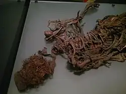 The body was wrapped in a sheepskin cape with a leather cloak tied around the woman's legs.[8][12] The face of the woman was poorly preserved as well as no traces of organs inside of the body.[13] The woman was hanged like the Tollund Man, who was found in the same bog twelve years later. This body is often recognized by its 90 centimeter braid, which was tied into an elaborate knot.[8][13] Elling Woman is believed to have been a human sacrifice.[14] | |