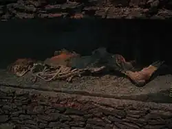 For some time, The Haraldskær Woman was thought to have been the Norwegian Queen Gunnhild, until carbon-14 dating proved she was much older. Studies show she was around 40 years old[20] and in good health when she died. Her clothing was placed on top of her naked body.[21][22] |
