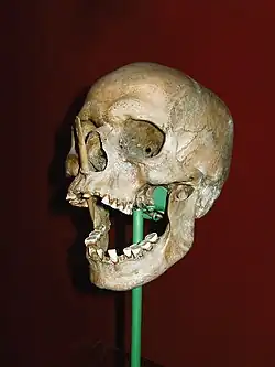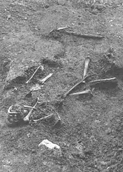 The Dätgen Man was found in 1959 near Dätgen, Germany. He had been stabbed, beaten, and decapitated. His severed head was found 3 metres (10 feet) from his body. He is not believed to have been sacrificed, but to have been killed and then mutilated, perhaps to prevent him from becoming a "wiedergänger", similar to a zombie.[56] His severed head displayed a Suebian knot. | |