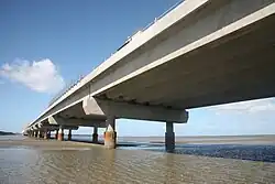 - ^ The length given only takes into account the main bridge, central span(s) and shore span(s), approach viaducts are not counted.
