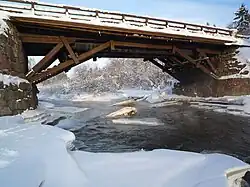 75 m (246 ft) | Beam bridge Wooden strut framed bridge, masonry abutments |