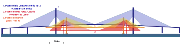 2 | Engineer Carlos Fernández Casado Bridge | 440 m (1,440 ft) | 643 m (2,110 ft) | Cable-stayed Concrete box girder deck, concrete pylons 65+440+65 |