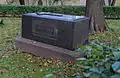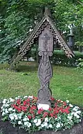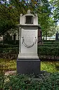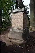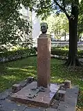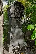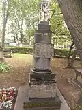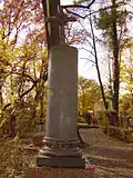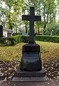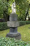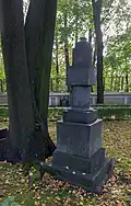During the early Soviet period a number of monuments were stolen or destroyed. The cemetery was officially closed for burials in 1927, though they continued until 1932, and it was decided to turn it into a necropolis museum, displaying historically and artistically significant graves.[2][1] Alongside this was concept of gathering together the graves of the friends and contemporaries of Alexander Pushkin for the 1937 centenary commemorations of the poet's death. The architectural and planning department of Lensovet, the city administration, was tasked with creating a memorial park project.[2] Plans were drawn up by architects E.N. Sandler and E.K. Reimers, with further input from the city's chief architect L.A. Ilyin.[2] The Funeral Affair Trust was established to run the necropolis museum, including removing abandoned gravestones for sale as building materials.[4] The reconstruction radically altered the nature and appearance of the Tikhvin cemetery. With the intention being to create an "artists' necropolis", graves of those from other sections of society were removed. Fewer than a hundred of the original monuments were preserved.[2] Meanwhile, the remains of prominent artists, sculptors, composers and musicians were reburied in the cemetery. Among them were personal friends of Pushkin, including Konstantin Danzas, Anton Delvig, and Fyodor Matyushkin.[2]