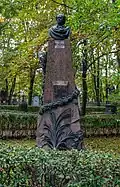 Over time the cemetery became a popular and prestigious burial ground for those of many areas of society. The wealthy merchant A.I. Kosikovsky was buried under a monumental sarcophagus on a high pedestal surmounted by a canopy on eight fluted columns.[4] Opposite it stood a similarly grand monument to the statesman Pavel Demidov, which has since been lost.[4] In 1857 the remains of the composer Mikhail Glinka were returned from Berlin and buried in the cemetery, with a grand monument erected two years later to the design of architect I. I. Gornostayev, with sculptures by Nikolay Laveretsky.[4][9] On 1 February 1881 the author Fyodor Dostoevsky was buried in the cemetery, with a similarly large monument.[4][10] During the 1880s composers Modest Mussorgsky and Alexander Borodin were buried in the northern part of the grounds, with Pyotr Ilyich Tchaikovsky following in 1891.[4][11][12][13]