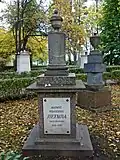 Stage actress, Imperial Theatres. Originally buried in the Smolensky Cemetery, transferred to the Tikhvin in 1936. Monument bust destroyed by bomb in 1943 during the siege of Leningrad. Replaced with a copy in 1955.
