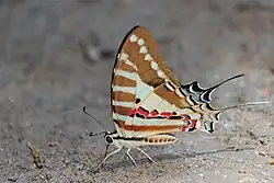 The genus Bhutanitis contains large butterflies that are black with thin white stripes above, have red and yellow tornal patches on the hindwing, and a number of tails, which are found in the region of Bhutan, Northeast India, Myanmar, Thailand and South China.