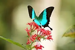 Indian swallowtails are spread over all the biomes/ecoregions of India. The Malabar banded peacock (Papilio buddha) and the Malabar banded swallowtail (Papilio liomedon) fly at sea level while the Apollos (Parnassius species), are to be found only in the highest alpine meadows of the Himalayas. Some species such as the common Mormon (Papilio polytes) and the blue Mormon (Papilio polymnestor) fly at ground level whereas others, such as the tailed jay (Graphium agamemnon) are normally found flying high in the forest canopy. The lime butterfly (Papilio demoleus) is a creature of arid scrub-land, occasionally being spotted even in the Thar Desert, while the tropical evergreen forests have their own representatives, such as the red Helen (Papilio helenus), the common bluebottle (Graphium cloanthus) and the Malabar raven (Papilio dravidarum).[3] Indian papilionids such as the common Mormon (Papilio polytes) and great Mormon (Papilio memnon) show polymorphism with many mimetic female forms.[4][5]