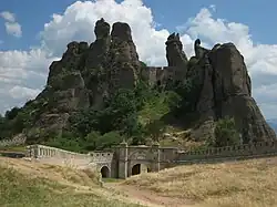 Asen's Fortress, identified by some researchers as Petrich, is a medieval fortress in the Rhodope Mountains, 2–3 km south of the town of Asenovgrad, on a high rocky ridge on the left bank of the Asenitsa River. Asen's Fortress is situated at an elevation of 279 m. The earliest archaeological findings date from the time of the Thracians, the area of the fortress being also inhabited during the Ancient Roman and Early Byzantine period. The fortress gained importance in the Middle Ages, first mentioned in the statute of the Bachkovo Monastery as Petrich in the 11th century. | ![]() |
