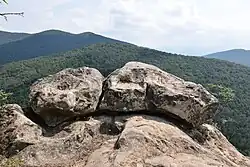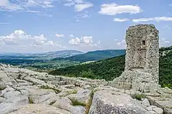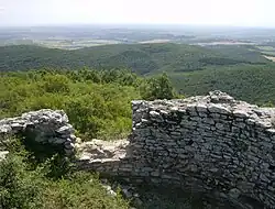 Ustra is a castle in the eastern Rhodope Mountains in southern Bulgaria. Its ruins lie 4 km (2+1⁄2 mi) southwest of the village of Ustren situated on a hill at approximately 800 m (2,600 ft) above sea level. The fortress was built in the 10th century AD to protect an important trade route. It was taken by the armies of Simeon the Great (r. 893-927), but after his death, it was among the lands given back to Byzantium in return for recognition of the imperial title of the Bulgarian rulers. Between the 12th and 14th centuries, it frequently changed hands between the two empires, but the Byzantines held it most of the time. | ![]() |