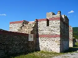 Mezek Fortress, 6.5 decares (6,500 square metres) in area, is among the best preserved Bulgarian medieval castles. It dates to the 11th century. Along with the Thracian tombs located nearby, it was studied by a team under archaeologist Bogdan Filov in 1931–1932. The castle has nine towers, five of which lie at the vulnerable south wall. The fortress was built out of stone, with two decorative lines of bricks on the outside. It suffered some destruction around 1900, when stones from the fortress were used for the construction of Ottoman barracks in Svilengrad. | ![]() | |