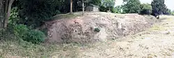 | This Norman castle was intended both to protecting the local villages and probably intended to operate with the castles at Glasshouse Woods and Howle Hill Camp as a screen to protect the city of Gloucester from military threats from Wales.[31] The castle itself is circular and relatively small, some 60 ft in diameter, with an inner and an outer bailey, the latter protected by a very tall vallum wall.[45] The outer wall was originally 15 ft tall.[46] Uniquely for a castle of this period the outer wall has a motte integrated into the design, rather than located at the centre of the castle.[44] Littledean castle was only occupied briefly.[44] | ||||