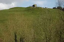 | The castle motte today is 14 m high, with the traces of the bailey to the south-east.[23] During the Anarchy the castle was given to William de Braose, the son-in-law of the powerful Miles de Gloucester.[24] After the conflict the castle is believed to have probably been destroyed by Henry II as part of a wider programme of castle denigration in Gloucestershire during the 1160s.[20] | ||||