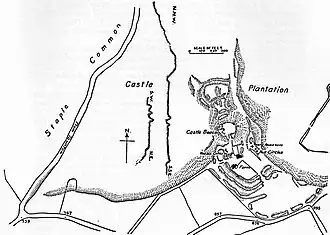 Probably a motte-and-bailey castle, although there has been some debate about its origin and purpose.[39][40] The motte has two baileys to the north. The inner bailey has one bank and the outer one a double bank. Norman and later pottery and iron objects were found during excavations in 1908.[38] The mound measures 30 metres (98 ft) across the top.[41] |