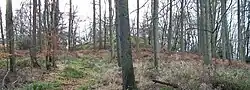 Possibly a Norman motte and bailey castle on a 450 feet (140 m) high outcrop[34] that since at least 1839 has been termed a castle site. Archaeological and geophysical research has found a ditch around the hilltop, with a masonry square within it, while fragments of 12th century pottery have been found on the site.[35] One theory is that this is a Norman motte; another that it is a 13th-century manor house;[36] alternatively it may be simply have been a local folly.[35] |
