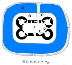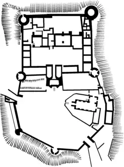 A ringwork design with a ditch and bank, up to 5 feet (1.5 m) deep. During the first half of the 13th century a stone circular keep and low curtain wall was built at the castle, along with one or two other stone buildings within the ringwork. A medieval deer park may have been attached to the castle.[37] |