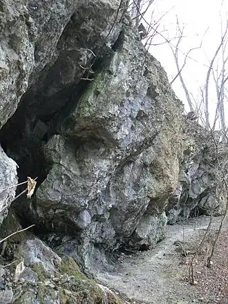 • Rocky Gap - Located in Tuscarora Sandstone about 350 feet (110 m) above the Rock Gap Run. This fissure cave extends 120 feet (37 m) to the southeast. The fissure averages five feet wide and five to ten feet high.[6]