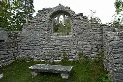 The churches of Saint Peter and Saint Hans (the latter may refer to either John the Baptist or John the Evangelist) are joined together and form a single complex. The church dedicated to Saint Peter is the older, probably from the middle of the 12th century. It was successively rebuilt and enlarged. The history of Saint Hans is opaque, but it was built as a basilica. During excavations, two runestones and a picture stone have been found among the ruins, pointing to a possibly even older, pagan sacred site. Both churches have in later centuries been used as quarries for limestone.[8][12] | |