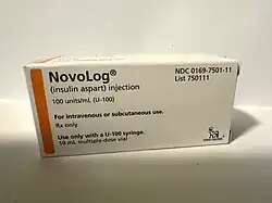 Insulin aspart, marketed under the brand name Novolog among others, is a modified type of medical insulin used to treat both type 1 and type 2 diabetes.[38] It is typically administered by injection under the skin (into the abdomen, buttocks, thighs, or upper arms), but can also be injected into a vein.[39] Its maximum effect occurs after about 1–3 hours and lasts for 3–5 hours.[40] A biosimilar version of insulin aspart, insulin-aspart-szjj, was released in 2025.[41]
