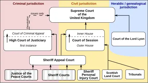 The courts of Scotland are part of the Scottish legal system. Each court has its own jurisdiction and in many cases, a right of appeal lies from one to another. Courts apply Scots law. Criminal cases are prosecuted by the Crown Office and Procurator Fiscal Service. and the Scottish Courts and Tribunal Service.[1] Scotland's supreme criminal court is the High Court of Justiciary. [2] The Court of Session is the supreme Scottish civil court[3] but UK-wide courts can review decisions of great public or constitutional importance.