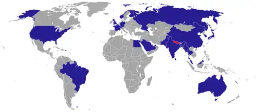 - ^ a b c d e f g h i j k l m n o p q r s t u v w x y z aa ab ac ad ae af ag ah ai aj ak al am an ao ap aq ar as at au av aw ax ay az ba bb bc bd be bf bg bh bi bj bk bl bm bn bo bp bq br bs bt bu bv bw bx by bz ca cb cc cd ce cf cg ch ci cj ck cl cm cn co cp cq cr cs ct cu cv cw cx cy cz da db dc dd de df dg dh di dj dk dl dm dn do dp dq dr ds dt du dv dw "List of Diplomatic and Consular Corps and Other Representatives" (PDF). Ministry of Foreign Affairs (Nepal). January 2025. Retrieved 8 July 2025.