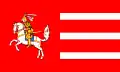 A white flag with 7 red and white stripes and a knight. The knight in white armor riding a white horse. It represents its readiness for warfare. Designed by Wilhelm Horst Lippert.